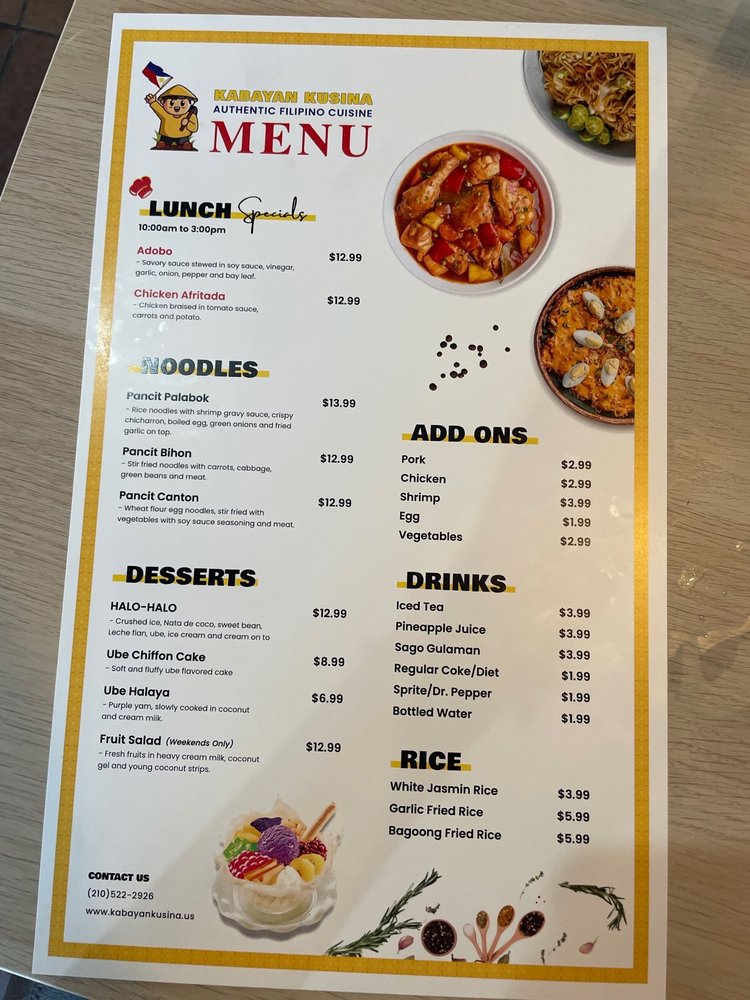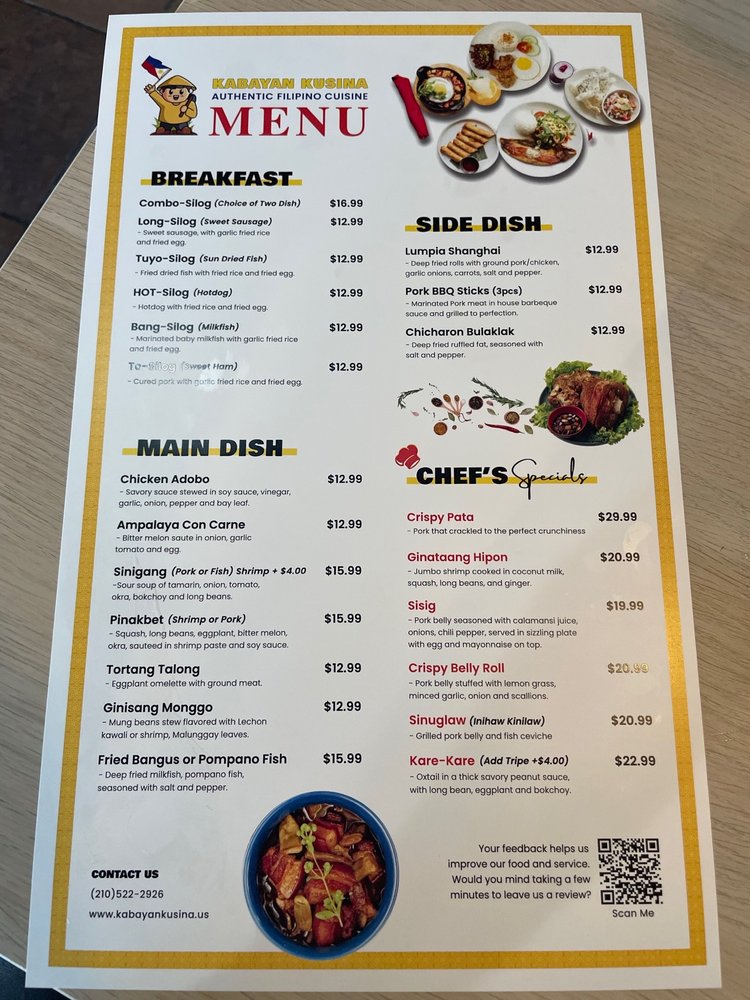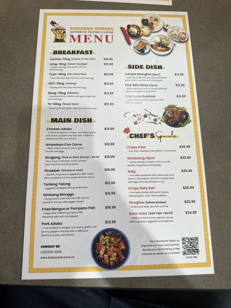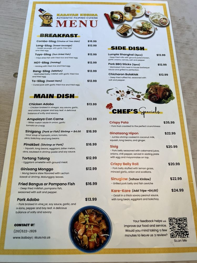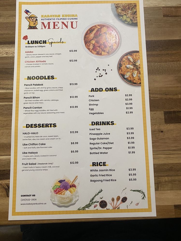 "Kabayan Kusina" in San Antonio is a hidden gem offering Filipino-Asian fusion dishes, breakfast, and brunch options. Customers rave about the delicious and beautifully presented home-cooked meals that bring a taste of nostalgia. The friendly atmosphere, quick service, and variety of options make it a favorite spot for families and food enthusiasts. Highlights include the crispy pork belly roll, lumpia Shanghai, sizzling sisig, and lechon kawal. Don't miss the pork ssig and pancit palabok, which are flavorful and well-balanced. The restaurant, though small, provides a cozy and welcoming environment for guests. Overall, "Kabayan Kusina" is a must-visit for those looking to experience authentic Filipino cuisine in a casual setting.