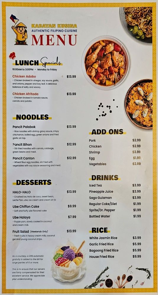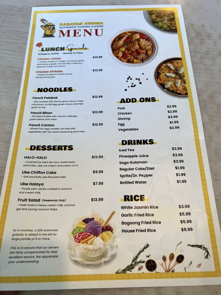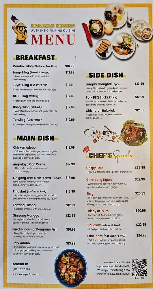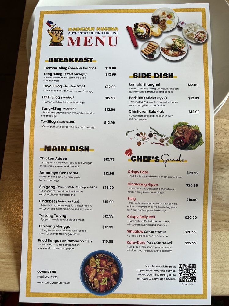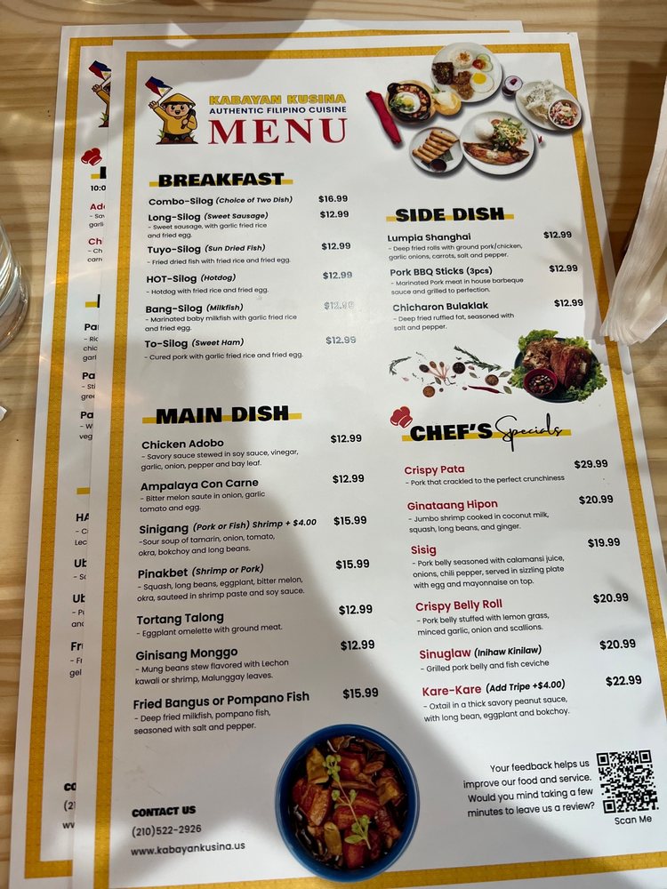 "Kabayan Kusina" in San Antonio is a hidden gem offering Filipino-Asian fusion dishes, breakfast, and brunch options. Customers rave about the delicious and beautifully presented home-cooked meals that bring a taste of nostalgia. The friendly atmosphere, quick service, and variety of options make it a favorite spot for families and food enthusiasts. Highlights include the crispy pork belly roll, lumpia Shanghai, sizzling sisig, and lechon kawal. Don't miss the pork ssig and pancit palabok, which are flavorful and well-balanced. The restaurant, though small, provides a cozy and welcoming environment for guests. Overall, "Kabayan Kusina" is a must-visit for those looking to experience authentic Filipino cuisine in a casual setting.